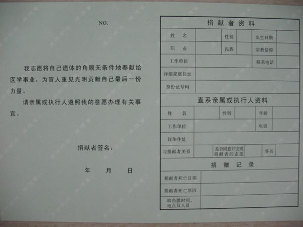 1、联系西安市眼库(联系电话:029-87630809,13700281883),在征得直系亲属同意的条件下,填写 《西安市眼库捐献遗体角膜志愿书》,办理角膜捐献手续。